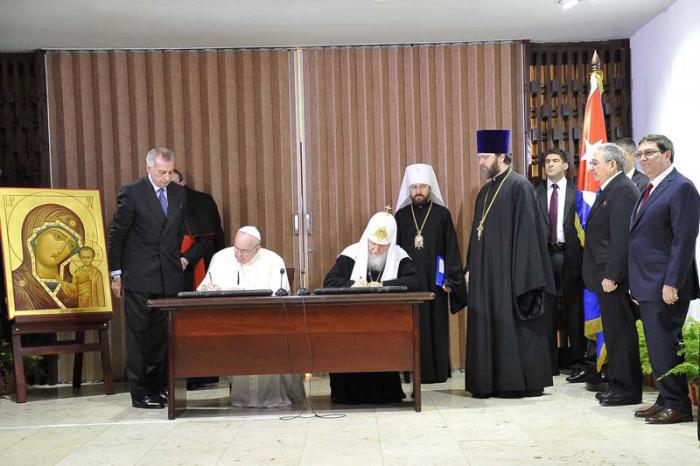 Depois de uma afetuosa saudação, os primados das igrejas Católica e Ortodoxa Russa tiveram um encontro privado, que demorou umas duas horas; e depois assinaram uma declaração conjunta que recolheu, em 30 pontos, aspectos chaves como a situação nos países do Oriente Médio e a África do Norte, a importância do diálogo interreligioso e o direito inalienável à vida, bem como o papel da família.