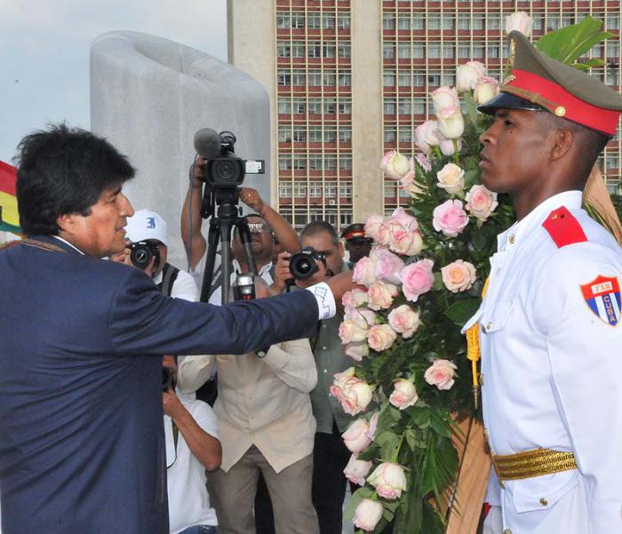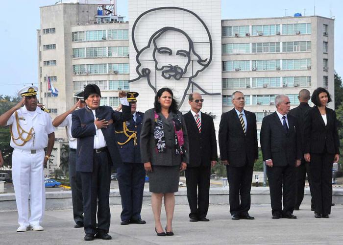 O presidente da Bolívia, Evo Morales, colocou na tarde da sexta-feira, 20 de maio, uma oferenda floral no Memorial José Martí, acompanhado da vice-presidenta do Conselho de Estado e membro do Bureau Político, Mercedes López Acea.