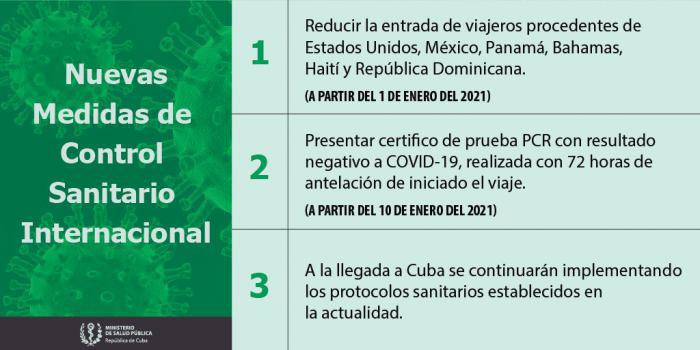 Levando em consideração esses elementos, a atual situação epidemiológica nacional, regional e internacional e a necessidade de se tomar um conjunto de medidas que possibilitem a redução dos casos da Covid-19 no país, decidiu-se reduzir a entrada de viajantes dos Estados Unidos, México, Panamá, Bahamas, Haiti e República Dominicana, a partir de 1º de janeiro de 2021, para o qual as autoridades da Aviação Civil cubana reajustaram os detalhes necessários com as companhias aéreas. Assim que a situação epidemiológica permitir, a frequência dos voos será restaurada gradativamente.