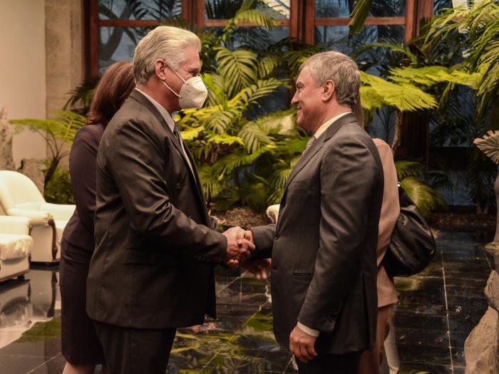 O primeiro-secretário do Comitê Central do Partido e presidente da República, Miguel Díaz-Canel Bermúdez, realizou uma reunião com Sua Excelência o sr. Viacheslav Volodin, presidente da Duma Estatal da Assembleia Federal da Federação Russa, que está visitando Cuba.