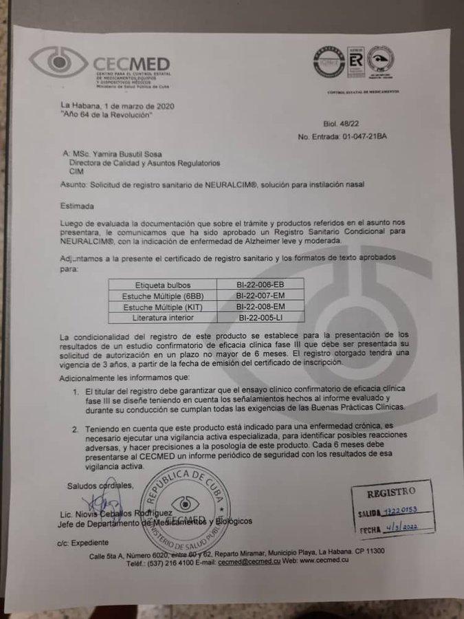O Centro para o Controle Estatal de Medicamentos, Equipamentos e Dispositivos Médicos (Cecmed) aprovou o Registro Sanitário Condicionado do medicamento NeuroEpo na indicação de Alzheimer leve e moderado, informou, nesta terça-feira, 8 de março, por meio de sua conta no Twitter, Dr. Eduardo Ojito Magaz, diretor-geral do Centro de Imunologia Molecular (CIM), instituição que desenvolve essa molécula.