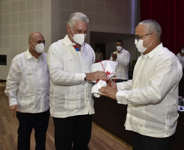 Vocês sabem que temos defendido muito a ciência e a inovação, como parte de um componente para fazer um trabalho político-ideológico, e que se trata de construir as interconexões necessárias entre o setor do conhecimento liderado por nossas universidades e nossas identidades de ciência, tecnologia e inovação com um setor produtivo de bens e serviços que tem que ser mais inovador, e com uma administração pública que também tem que ser mais inovadora, e que nós alcançamos toda essa interrelação, em que cenário? No desenvolvimento de estratégias territoriais em nível local, em projetos de desenvolvimento local, fortalecendo os sistemas produtivos locais e também fortalecendo o desenvolvimento da comunidade, da vizinhança, do município, através da província e até a nação. Isto também é apoiado pelos processos de informatização da sociedade, que agora aspiramos a levar ao conceito de transformação digital da sociedade, e pelo desenvolvimento e defesa do conceito de Poder Popular em nossa sociedade que Fidel projetou, que inclui participação popular, democracia, controle popular e educação popular, e que tem que criar três momentos intimamente relacionados: espaços como os que temos, que temos que melhorar, onde nosso povo, nossos trabalhadores e nossos jovens possam participar para dar critérios, criticar, propor, convocar, criar consenso.