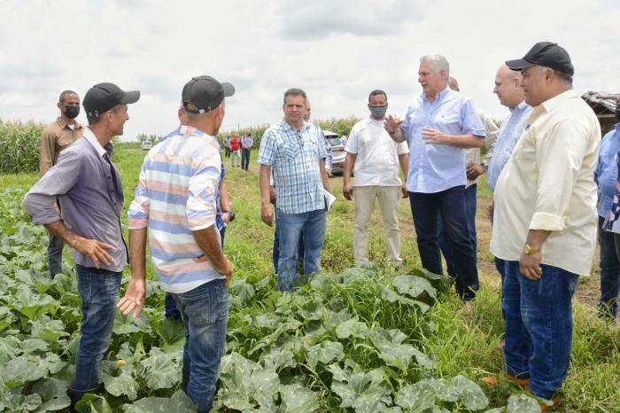 Durante a visita a Camaguey, Díaz-Canel foi ao bloco de produção Santa Rosa em Vertientes, localizado nas terras da cooperativa Juan Manuel Márquez. Ali, os irmãos Jesús e Leonardo Lezcano, juntamente com outros trabalhadores agrícolas, cultivam diversas culturas, como mandioca, milho e abóbora em 161 hectares. No momento, 72 estão em cultivo. Esta é uma estrutura produtiva que aproxima os alimentos das comunidades.