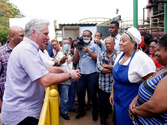 Sempre acompanhado pelas mais altas autoridades do Partido e do Governo da província, José Ramón Monteagudo Ruiz e Beatriz Johnson Urrutia, na saída do edifício industrial o presidente falou com técnicos, pessoal administrativo e de cozinha e outros serviços, para reconhecer o esforço significativo que todos dedicam para garantir a eletricidade ao povo.