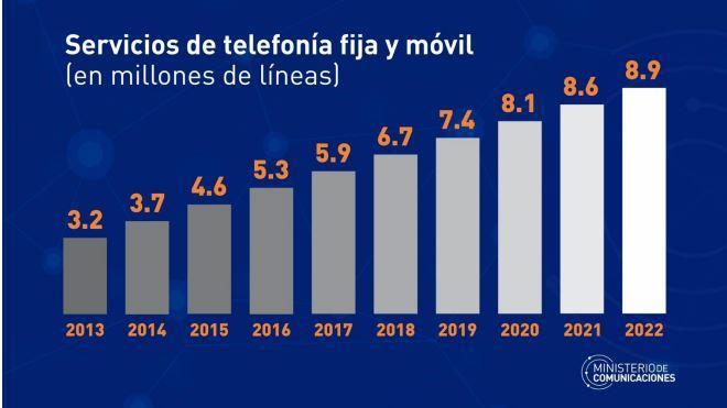 • Mais de 7,5 milhões de pessoas acessam a Internet, principalmente através da telefonia móvel (6,3 milhões em quatro anos), o que inclui ofertas mais acessíveis e planos em pacotes (voz, SMS e dados). Seu consumo médio mensal cresceu seis vezes entre dezembro de 2019 e julho de 2022 (de 1,1 Gb para 6,6 Gb).