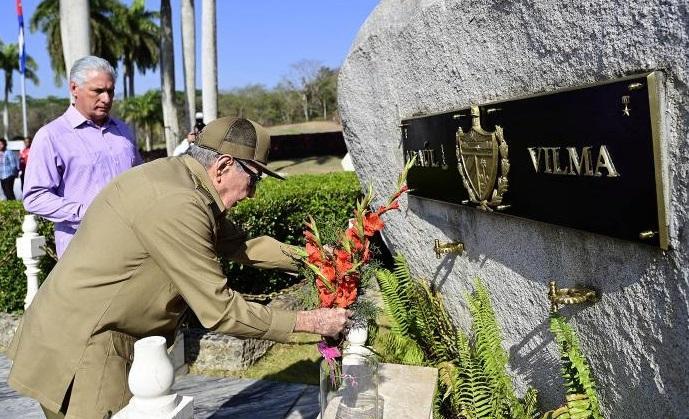 No final da cerimônia, Raúl, junto com Díaz-Canel e os outros participantes, colocou gladíolos diante da chama eterna e, após um breve passeio pelo mausoléu onde os restos mortais dos combatentes desta frente guerrilheira, caídos na guerra de libertação ou que morreram após o triunfo revolucionário, são colocados para descansar, veio a homenagem à heroína da Serra e das planícies, Vilma Espín Guillois, diante de cuja pedra o general-de-exército colocou um ramo de flores, símbolo de amor e respeito pela história que, na vida e na luta, eles escreveram juntos.