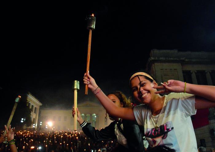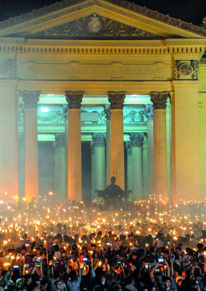 Do alto da Alma Mater, na Universidade de Havana, até o fundo dos degraus, até os níveis mais baixos de uma rua larga, até o fundo do que já foi uma pedreira, de pedra, de calcário que rachava a pele, um inferno de grilhões em que colocavam o quase menino para fazê-lo desistir, para fazê-lo engolir suas palavras, sua honra, seu orgulho... Até mesmo havia uma luz, na noite passada.