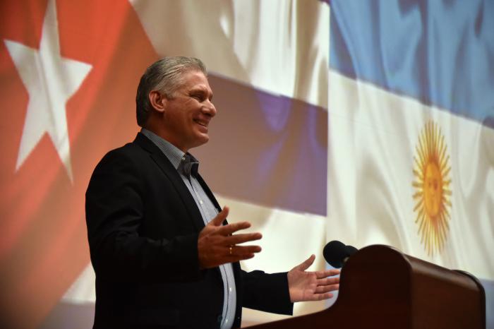 Amigos e emoções que já eram inseparáveis de nossos sentimentos se juntaram a essa história, incluindo todos os companheiros que Che Guevara arrastou com ele na construção de nossos sonhos de justiça social nos anos fundamentais, tendo presente também a dor compartilhada pelos 30 mol desaparecidos em Argentina (Aplausos), as lutas das avós e mães da Praça de Maio (Aplausos); a paixão pelo futebol, Maradona e sua amizade pessoal com Fidel (Aplausos); o melhor do cinema latino-americano e do rock argentino até chegar a Nestor e Cristina (Aplausos), cujo legado agora se cristaliza no triunfo de Alberto, e amanhã, quando o amanhecer na Argentina estiver mais intenso, mais brilhante, Cuba estará com vocês (Aplausos)