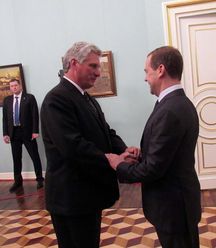 Moscou.— O chefe de governo russo, Dmitri Medvédev, recebeu a quinta-feira, 26 na sede do Executivo ao primeiro vice-presidente dos Conselhos de Estado de Ministros de Cuba, Miguel Díaz-Canel, para analisar o desenvolvimento dos nexos bilaterais com as delegações de ambos os países.