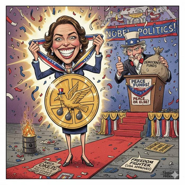 Terceiro Ato. A cortina se abre: o secretário de Estado dos EUA a indica para o Prêmio Nobel da Paz. O prêmio é concedido. A cortina se fecha: após «ganhá-lo», ela o dedica «ao povo da Venezuela e ao presidente Trump por seu apoio decisivo à nossa causa». Sim, o mesmo com cerca de 1.200 mísseis apontados para a nação sul-americana.