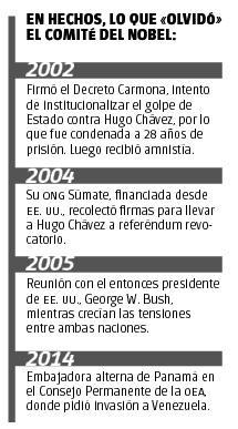 O que foi recompensado, então, pela traição à pátria, ao seu povo? Paz? Será que a ativista de extrema direita sequer conhece o significado dessa palavra? Parece que não, já que sua carreira política tem sido dedicada a alcançar uma «mudança de regime», sempre por meio de uma solução violenta, muito diferente do «trabalho incansável em prol dos direitos democráticos do povo venezuelano e de sua luta para alcançar uma transição justa e pacífica da ditadura para a democracia», como alegou o Comitê Nobel.