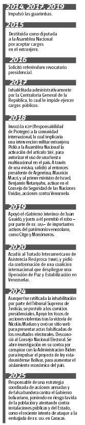 Machado repudiou os resultados das eleições presidenciais de 2024 antes mesmo de ir às urnas, já que seu companheiro de chapa, Edmundo González Urrutia — que apenas forneceu seu nome para a cédula — não assinou o acordo de reconhecimento dos resultados eleitorais, assinado pelos demais candidatos desde junho. Este seria seu anúncio formal sobre as tentativas de golpe que se seguiriam, especialmente com o apoio dos «comanditos» terroristas, grupos do crime organizado que buscavam perturbar a paz pós-eleitoral no país, financiados pela extrema direita e seu aliado mais leal: os Estados Unidos.