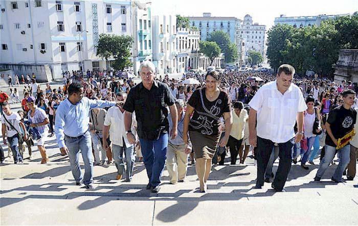 Díaz-Canel também acompanhou a tradicional ascensão pela escadaria da Universidade dos jovens que ingressam na Universidade de Havana (UH), desta vez acompanhado do titular do Ensino Superior, Rodolfo Alarcón, e do reitor da Universidade, Gustavo Cobreiro.