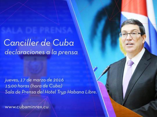 Bruno Rodríguez Parrilla, ministro das Relações Exteriores, dará declarações à imprensa nacional e estrangeira hoje, às 15 horas, na Sala de Imprensa do hotel Tryp Habana Libre.