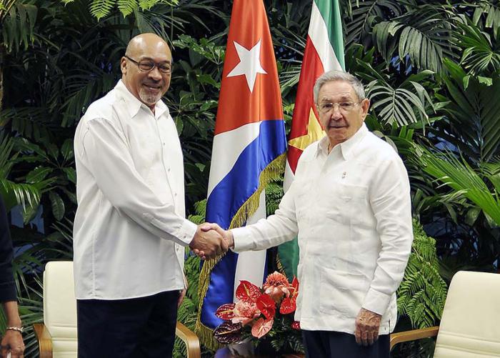 O presidente dos Conselhos de Estado e de Ministros, general-de-exército Raúl Castro Ruz, recebeu no domingo 5 de junho, o presidente da República de Suriname, Exmo sr. Desiré Delano Bouterse, quem participou da 7ª Cúpula da Associação dos Estados do Caribe (AEC).