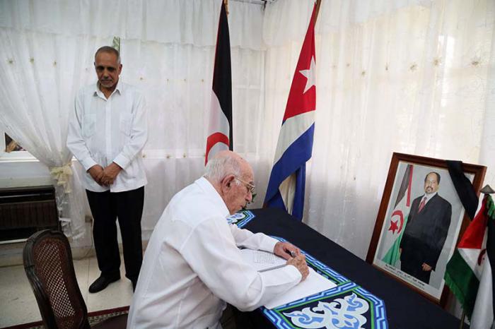 Após ter sido recebido na sede diplomática pelo embaixador da RASD em Cuba, o companheiro Machado Ventura deixou constância do pesar do povo, Partido e governo cubanos pelo falecimento do também secretário-geral da Frente Polisario; destacou os profundos sentimentos de irmandade e solidariedade existentes entre os dois países; reiterou nossa admiração pela luta saaraui, por sua completa autodeterminação e independência e o inquebrantável compromisso de nosso país com essa justa causa.