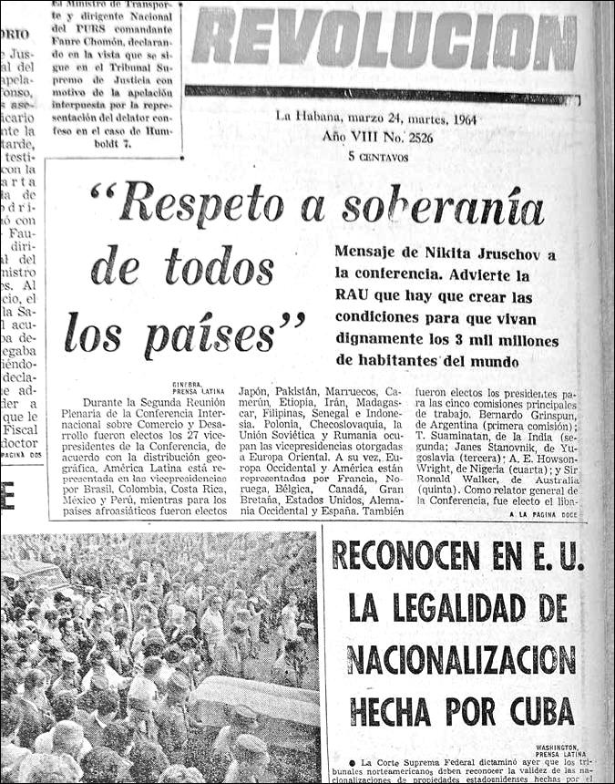 EM um caso inédito sobre Cuba, a Suprema Corte de Justiça dos Estados Unidos decidiu, em 23 de março de 1964, em Nova York, que os tribunais norte-americanos deviam reconhecer a validade das nacionalizações de propriedades norte-americanas feitas pelo Governo Revolucionário de Cuba.