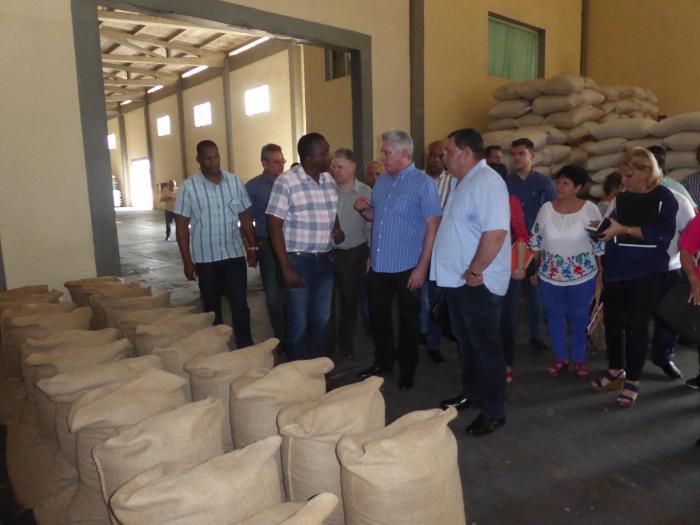 O presidente cubano percorreu as áreas do processador e trocou com os trabalhadores, lembrando aos gerentes e técnicos da Eladio Machín que são responsáveis por promover e garantir o sucesso do programa de desenvolvimento do café na planície.