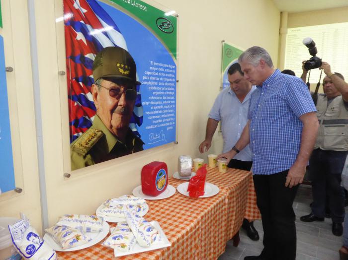 Díaz-Canel foi informado de que, como novas produções na fase do projeto são creme de chocolate, iogurte probiótico e molho de soja (creme).