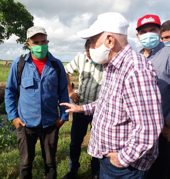 Em áreas sob irrigação da fazenda La Caoba, constatou o esforço para potencializar o plantio de culturas variadas, enquanto na fazenda do usufrutuário René Rodriguez apreciou a atenção cultural e o aproveitamento das terras afetadas pelas chuvas, exortando a empregar racionalmente o combustível e a misturar as culturas.