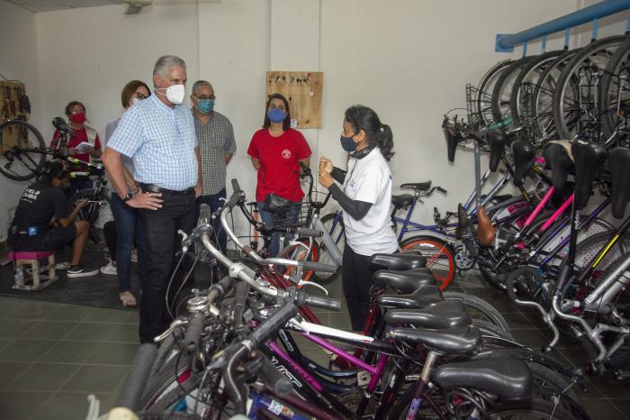 Díaz-Canel destacou o valor deste empreendimento — onde predominam as mulheres, inclusive as que trabalham como mecânicas– retomar e promover o uso da bicicleta (ciclomobilidade) de forma massiva, como alternativa de transporte sustentável, amiga da natureza e muito necessária para a saúde mental e física das pessoas.