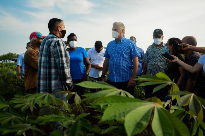 O primeiro ponto do percurso foi uma área pertencente ao município de San Nicolás de Bari, onde o produtor Osvaldo Fuentes disse ao presidente Díaz-Canel que a fazenda em frente à qual trabalha começou a ser promovida há pouco mais de um ano. Tudo teve que ser limpo, desmontado — como se costuma dizer para tirar a vegetação que deu lugar a um campo onde hoje crescem banana e milho. Os benefícios, conforme explicado pelo produtor, são palpáveis.