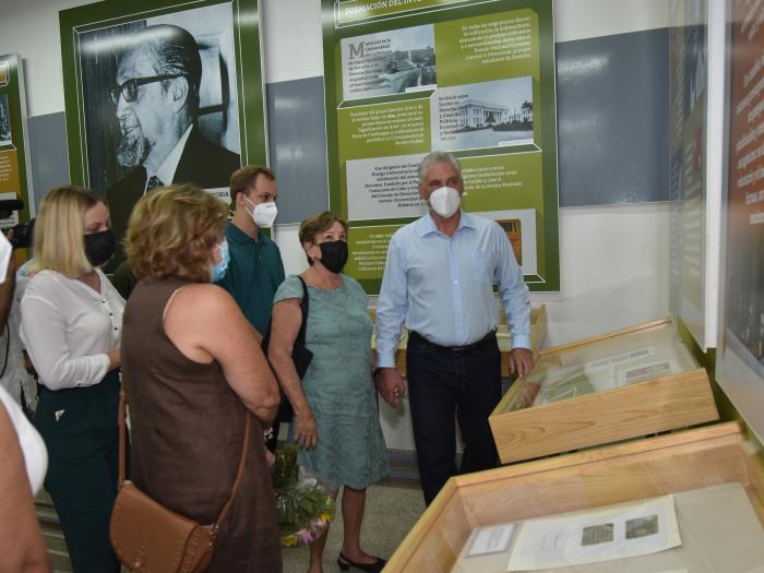 Em seguida, o chefe de Estado fez uma visita pelos diferentes espaços do Instituto Politécnico. O primeiro lugar foi uma visita a uma galeria que reúne momentos da vida de Carlos Rafael Rodríguez. O presidente Díaz-Canel percorreu as imagens junto com Dania, filha do excepcional pensador, e muito próxima de outros parentes do homem que dá nome ao centro.