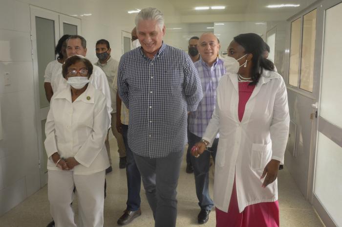 O chefe de Estado visitou a fábrica de Soluções Parenterais, que é responsável por 50% da produção nacional. Lá ele perguntou, entre outras coisas, sobre atividades como o controle de qualidade, e queria saber se a fábrica teria ou não interrupções entre os diferentes objetivos que se apresentam: um trabalhador respondeu que não deveria haver interrupções; e o diretor-geral, um homem que vem do mundo da química e do trabalho partidário, falou em «continuar procurando variantes» para remover o fardo do terrível bloqueio econômico que Cuba sofre.