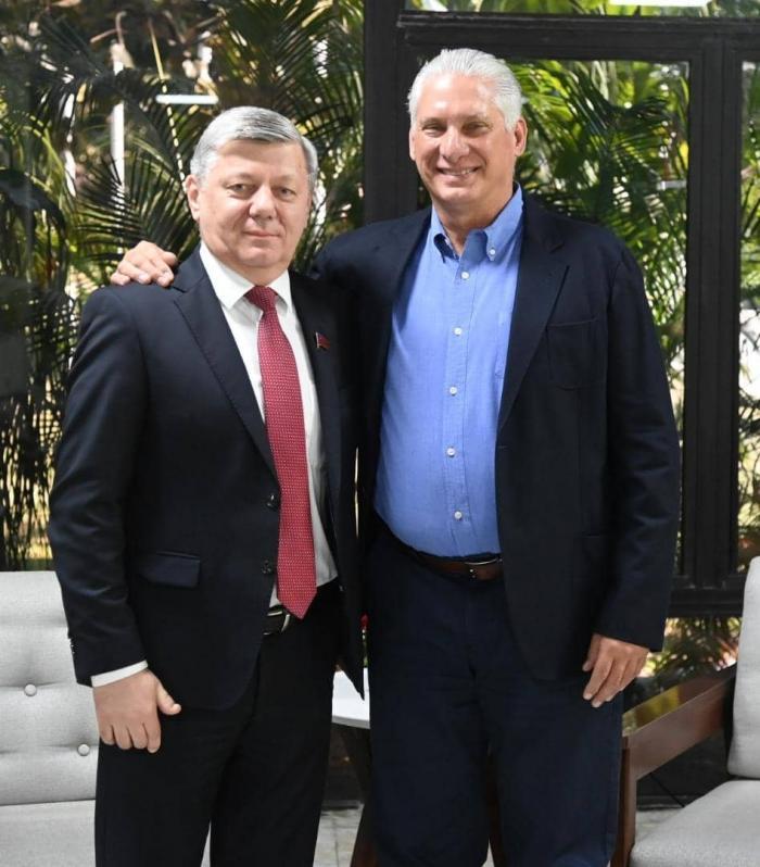 Em seguida, o presidente cubano falou dos laços de amizade e fraternidade que existem entre Cuba e Rússia com Dmitri N. Novikov, primeiro vice-presidente do Comitê das Relações Internacionais da Duma e coordenador do Grupo Parlamentar de Amizade Rússia-Cuba.