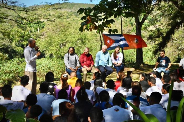 À sombra das árvores, foi um intercâmbio para rever a história e a epopeia libertária do povo cubano e falar sobre os desafios atuais, mas também, disse Díaz-Canel, «para nos nutrirmos de suas ideias, compartilhar o que temos de fazer no presente e canalizar como vocês podem se tornar cada vez mais empoderados».