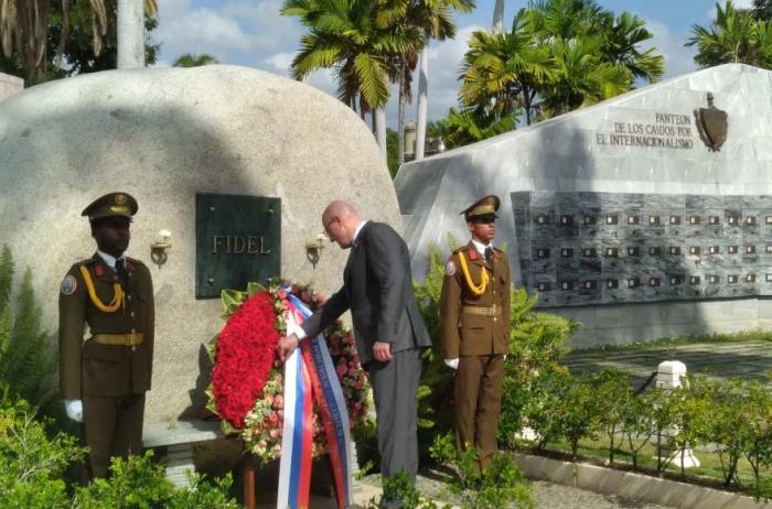 Santiago de Cuba.— «É uma grande honra para mim estar aqui e prestar homenagem aos heróis cubanos que deram suas vidas por sua pátria», disse Dmitry Chernyshenko, vice-presidente do Governo da Federação Russa, depois de prestar homenagem no monólito que guarda as cinzas do Comandante-em-chefe Fidel Castro Ruz, o principal arquiteto das relações entre Cuba e Rússia. Lá, Chernyshenko depositou uma coroa de flores, como culminação da homenagem que prestou, no cemitério histórico de Santa Ifigênia, a José Martí, Herói Nacional, e a Carlos Manuel de Céspedes e Mariana Grajales, Pai e Mãe da Pátria, respectivamente.