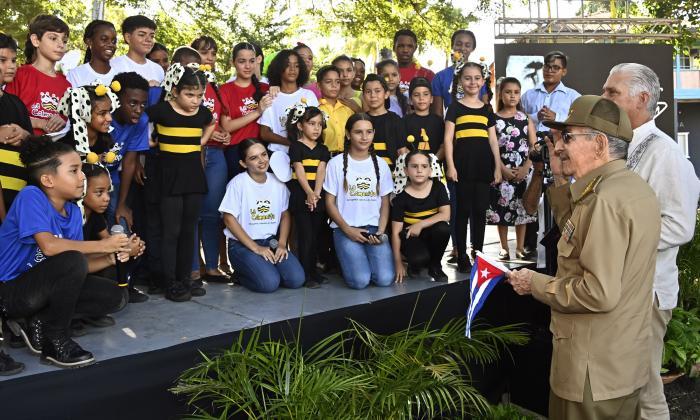 Após uma longa salva de palmas e uma exclamação coletiva de «Eu sou Fidel!», o general-de-exército e o presidente Díaz-Canel subiram ao palco para agradecer às crianças «por um espetáculo tão revolucionário, lindo e envolvente. Um abraço a todos», disse Raúl.