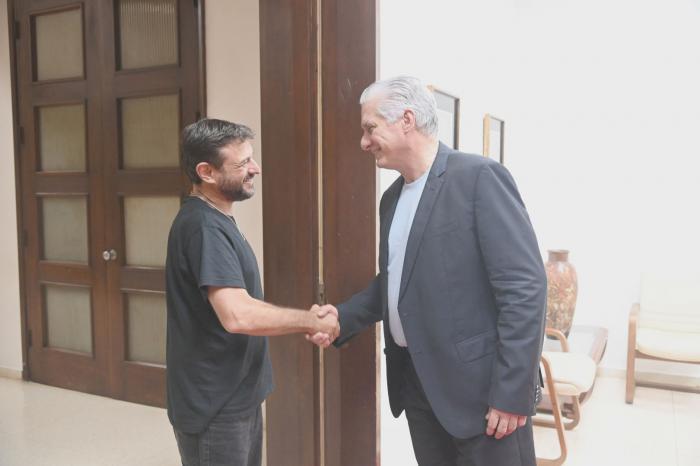 «É um prazer recebê-lo e poder conversar», disse Miguel Díaz-Canel Bermúdez, primeiro-secretário do Comitê Central do Partido Comunista de Cuba e presidente da República, na tarde de terça-feira, 17 de fevereiro, no Palácio da Revolução, ao dar as boas-vindas a Juan Grabois, líder do partido político Pátria Grande, da Argentina.