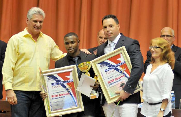 Falamos com o ginasta Manrique Larduet. Resultou pouco comum vê-lo envergando fato e gravata e não com seu costumeiro fato de ginasta, com a bandeira cubana em meio do peito, filigranas de gloria no éter. Sempre o sorriso e os sonhos como divisa. Manrique recebeu o troféu das mãos do primeiro vice-presidente dos Conselhos de Estado e de Ministros e membro do Bureau Político do Comitê Central do Partido Comunista de Cuba, Miguel Díaz-Canel Bermúdez.