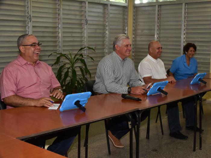 O presidente cubano foi acompanhado pela drª Ena Elsa Velázquez Cobiella, titular do Ministério da Educação (Mined), o vice-presidente dr. Roberto Morales Ojeda e autoridades do Partido e do governo em Havana.