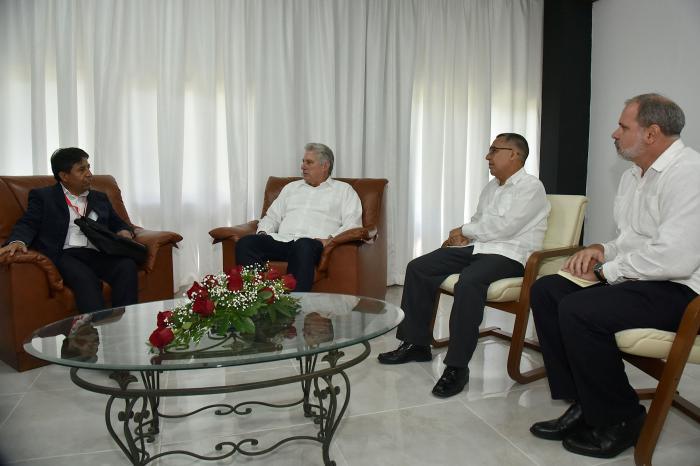 O presidente da República de Cuba, Miguel Díaz-Canel Bermúdez, recebeu no domingo, 3 de novembro, o secretário executivo da Aliança Bolivariana para os Povos da Nossa América - Tratado de Comércio dos Povos (ALBA-TCP), David Choquehuanca Céspedes, que participa da Reunião Antiimperialista de Solidariedade, pela Democracia e Contra o Neoliberalismo, realizada de 1 a 3 de novembro em Havana.