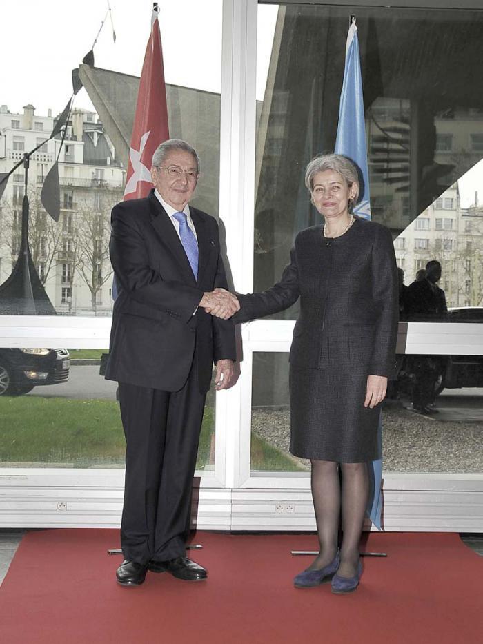 Na entrada principal do edifício Raúl foi recebido pela diretora-geral, Irina Bokova, que ocupa esse cargo desde 2009 e com quem já se havia reunido em Havana em duas ocasiões, uma em novembro de 2012 e mais recentemente, em setembro de 2015.