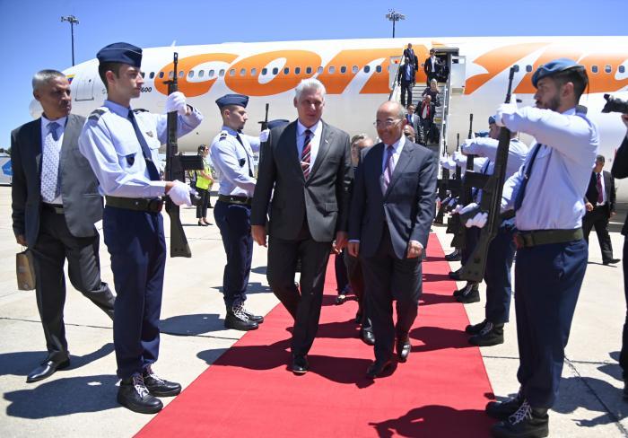 Ao aterrissar no aeroporto internacional Humberto Delgado, o chefe de Estado, juntamente com sua acompanhante Lis Cuesta Peraza, foi recebido ao pé da escada da aeronave pelo embaixador de Portugal em Cuba, José Pedro Machado Vieira, bem como por Yusmari Díaz Pérez, embaixadora do país caribenho.