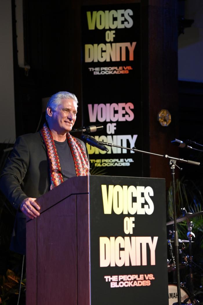 Como sabem, estamos participando, como parte de uma delegação cubana, do 78º período de sessões da Assembleia Geral das Nações Unidas. Viemos aqui não apenas para levantar a voz do povo cubano; viemos também para levantar a voz dos povos do Sul (Aplausos e exclamações), porque Cuba preside atualmente o Grupo dos 77 mais a China, um grupo de mais de 133 nações do Sul que coordena ações em favor dos países em desenvolvimento; um grupo diverso formado fundamentalmente por nações da África, da Ásia, da América Latina e do Caribe, e nesse grupo nós somos o Sul!