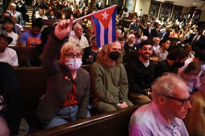 Estamos muito emocionados e comovidos por participar deste ato de solidariedade de vocês, as dignas vozes dos Estados Unidos, as dignas vozes do povo norte-americano que dão enorme apoio a Cuba e à Venezuela, às nossas revoluções irmãs, dizendo não às sanções e aos bloqueios (Aplausos e exclamações).