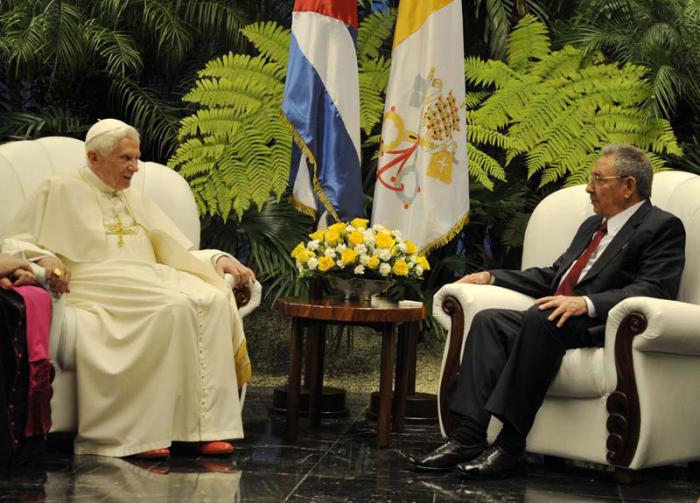 Bento XVI foi recebido oficialmente no Palácio da Revolução pelo presidente dos Conselhos de Estado e de Ministros, general-de-exército Raúl Castro Ruz, quem em 26 de março de 2012 deu as boas-vindas ao papa no aeroporto internacional José Martí.Photo: Estudio Revolución